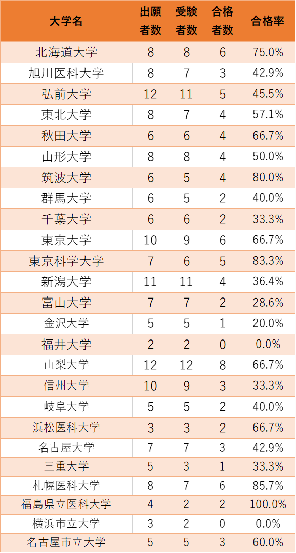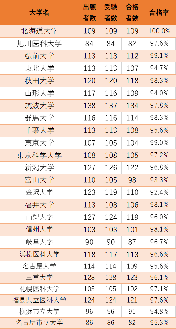 今回は先日発表された第120回医師国家試験(2026年実施)における、北海道から東海地方の国公立大学合格率を大学別でまとめました。
