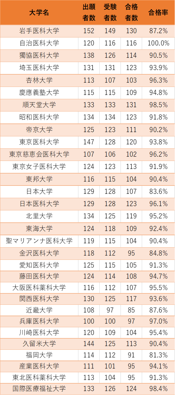 総数の合格率が最も高かったのは自治医科大学、その次は順天堂大学でした。