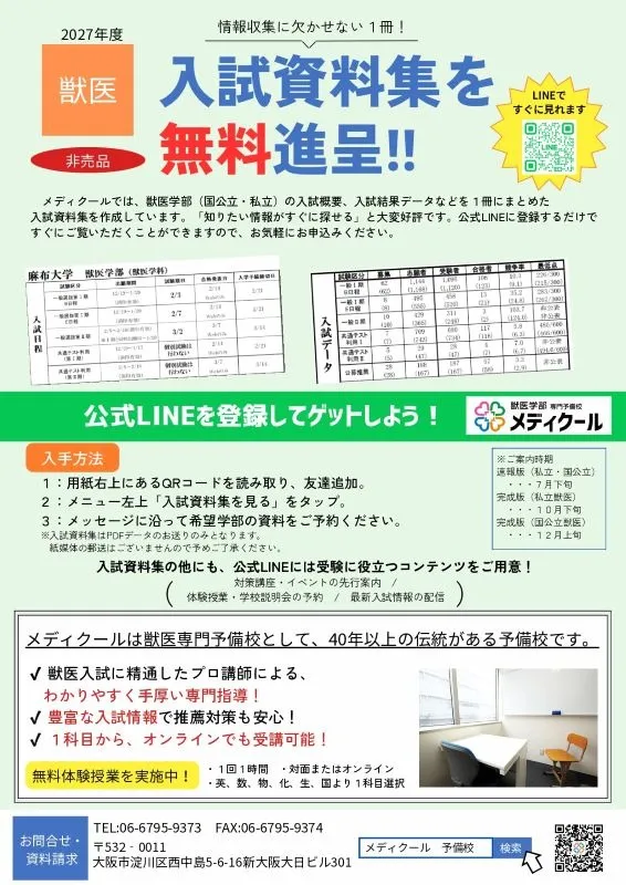 獣医学部受験を決定されている方はもちろんのこと、「受験するか決めていないけど入試情報を見比べてみたい」という方もぜひLINEよりご覧ください!