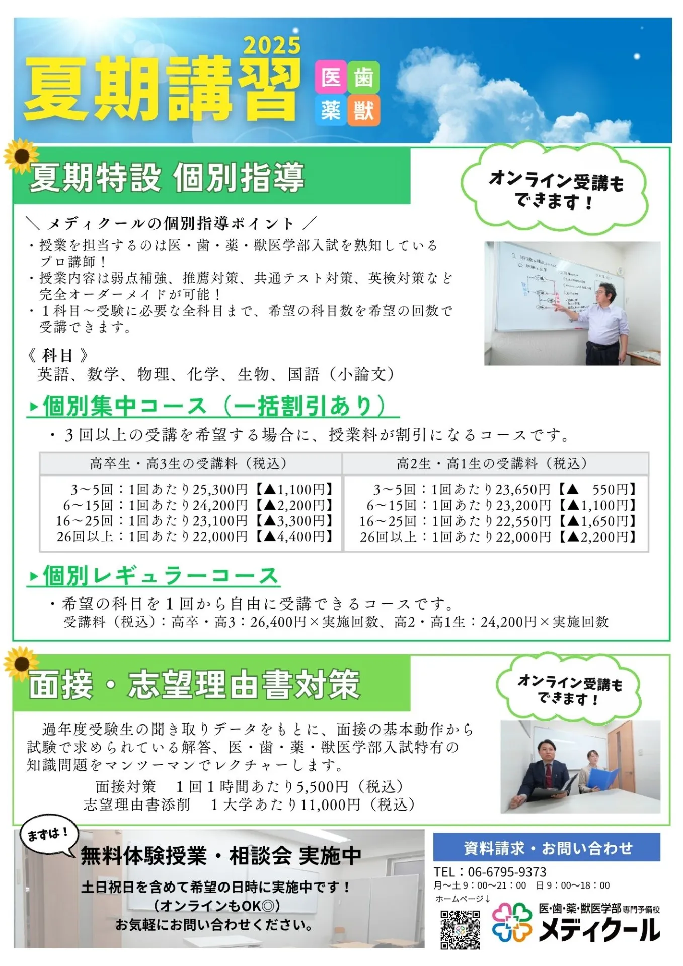 【歯学部】2025年度夏期講習のご案内 勝つための対策を始めよう!2025年度メディクール夏期講習のご案内です。今年も対面とオンラインから受講形式を選ぶことができる夏期講習を実施します!【メディクール夏期講習】①個別指導(全学年対象)…