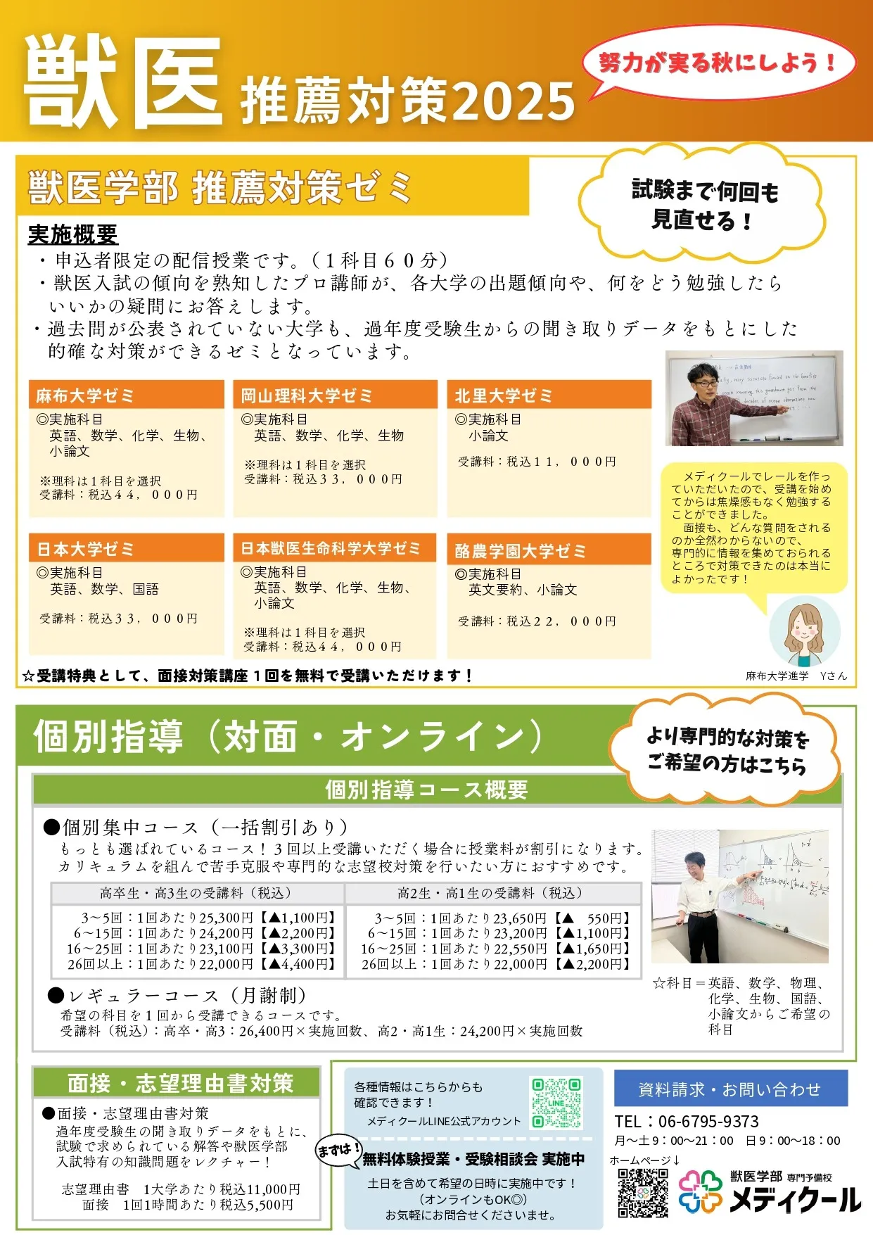 【獣医学部】2025年度夏期講習のご案内 勝つための対策を始めよう!2025年度メディクール夏期講習のご案内です。【メディクール夏期講習】①個別指導(全学年対象)メディクール個別指導のポイント!①授業を担当するのは獣医学部入試に精通した…